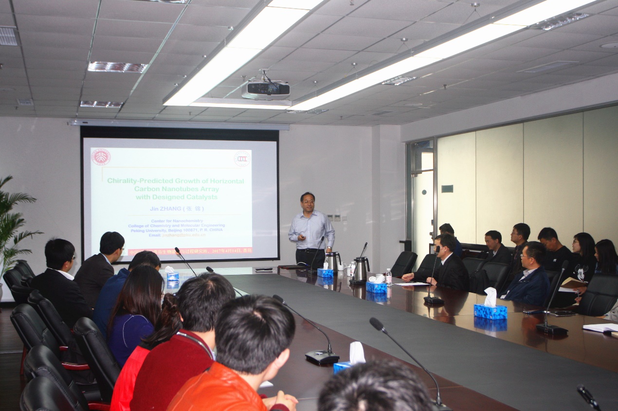 在报告中,张锦教授详细地介绍了高密度碳纳米管的合成原理和方法。他指出通过对催化剂化学结构、催化活性的调控,可以实现碳纳米管的可控生长。在报告中,张锦教授还深入分析了单壁碳纳米管序列生长的热力学和动力学机制。该报告结束后,参会人员就相关学术问题与张锦教授进行了探讨和交流。