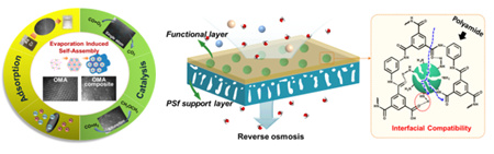近日,研究人员尝试将该类介孔材料引入到聚酰胺反渗透复合膜中,希望进一步提高海水淡化的效率。前期研究表明在聚酰胺膜中引入碳纳米管、介孔氧化硅等纳米材料,可以提高复合膜的水通量。由于常见纳米材料与聚合物基质之间的界面相容性较差,在提高水通量的同时复合膜分离选择性会显著降低。针对这一问题,该研究团队利用氨基功能化的介孔聚合物作为填充材料,通过调控介孔聚合物与聚酰胺基质之间的界面微结构,开发出具有较高水通量和高截盐率的纳米复合膜。研究表明介孔聚合物的介孔孔道作为水的快速传输路径,极大地提高了复合膜的渗透性能,在16 bar压力下,其水通量达55 L m-2 h-1;此外,其功能基团与聚酰胺链之间良好的相互作用增加了二者间的界面相容性,有效提高了复合膜的分离性能,对NaCl的截留率达98.7%。相关研究成果发表在《Journal of Membrane Science》期刊上(J. Membr. Sci., DOI: 10.1016/j.memsci.2019.117783)。