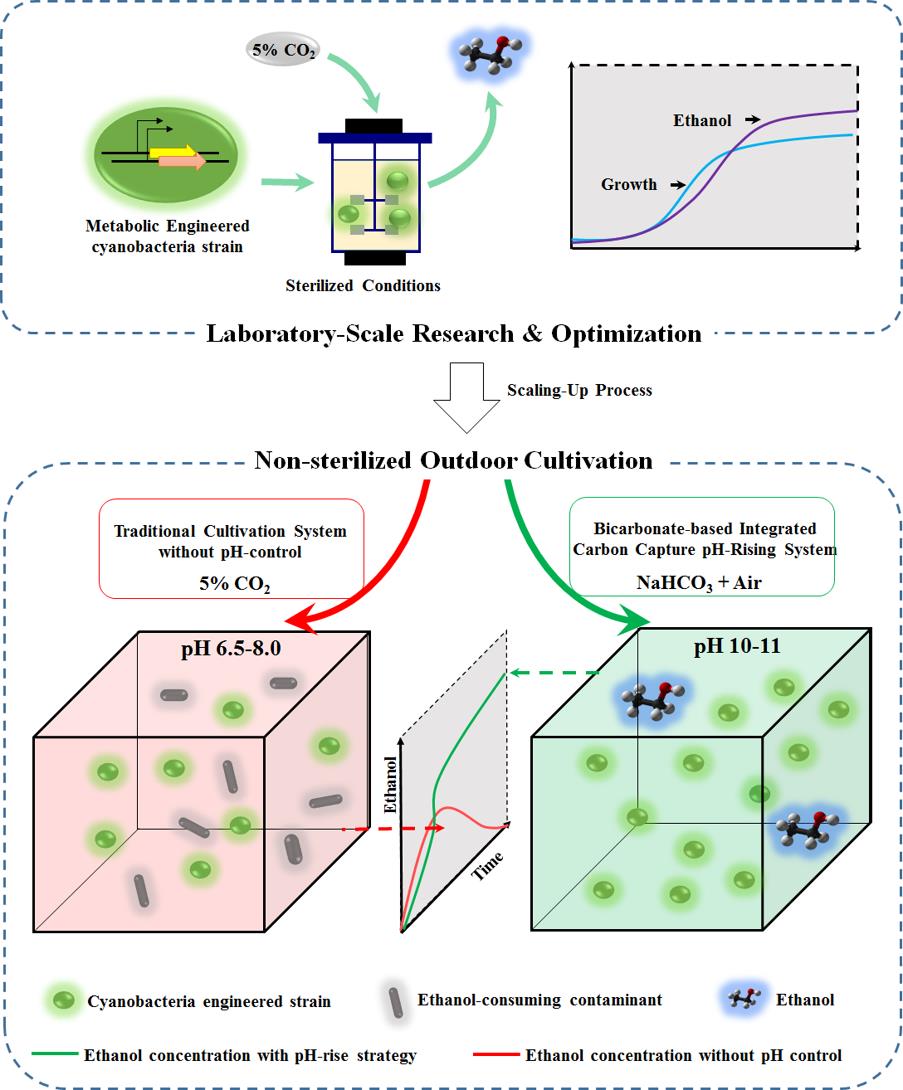 基于已经开发的蓝细菌乙醇光合工程藻株,该团队又进一步探索了光合细胞工厂的扩大化培养技术。光合生物制造通常在户外、开放式、未灭菌的条件下进行,因此经常面临各种模式的生物污染的严重威胁进而导致扩大培养的失败。研究人员在进行工程藻株Syn-HZ24的开放式、规模化培养中发现,其乙醇合成与积累过程受到了微生物污染的严重影响。通过分析和鉴定,确定了Pannonibacter phragmitetus为乙醇光合合成的主要威胁来源,该菌可以以乙醇为唯一碳源进行生长,迅速消耗工程藻株合成的乙醇并在培养体系中大量增殖。通过对Pannonibacter phragmitetus和Syn-HZ24的生理和生化分析,研究人员提出提高培养体系pH值来抑制Pannonibacter phragmitetus侵染并恢复乙醇光合合成的设想(Bicarbonate-based Integrated Carbon Capture System, BICCS),并在实验室柱式反应器和户外薄膜挂袋两种体系下进行了验证,结果表明该策略可以有效解决Syn-HZ24在开放式培养过程中的生物污染问题,在规模化培养9天后乙醇产量达到0.9g/L,而常规pH条件下的对照体系中无乙醇积累。此部分工作鉴定了一种工程蓝细菌规模化培养过程中新的生物污染模式,并针对性的设计、验证了解决方案,对光合细胞工厂培养的工程化、规模化发展有普遍的借鉴意义。该工作近期发表于Biotechnology for Biofuels杂志上(Zhu, et al, 2017, 10:93)。
