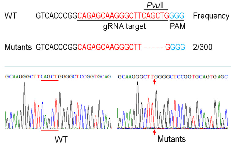 单细胞中心博士研究生王勤涛和路延笃博士等在海洋微拟球藻(Nannochloropsis oceanica)中,通过特定外源Cas9蛋白和指引RNA分子(guide RNA)的设计和共同表达,结合基于二代测序的高通量转化株鉴定方法,实现了位于硝酸还原酶基因编码序列的目标位点上五个碱基的精确删除(见下图),并筛选分离出与预测的表型与基因型均完全契合的基因组编辑突变藻株,从而在工业产油微藻中示范了基因组的精准编辑。