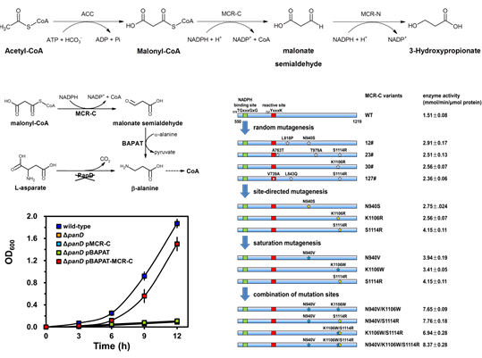 Liu C, Wang Q, Xian M, Ding Y, Zhao G. 2013. Dissection of malonyl-coenzyme A reductase of Chloroflexus aurantiacus results in enzyme activity improvement. PLoS One. 8(9):e75554. Doi: 10.1371/journal.pone.0075554.