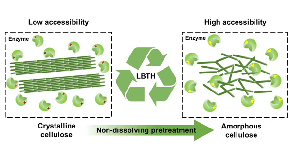 熔盐水合物(MSH)是 一种绿色高效的纤维素溶剂,已被用于纤维素的溶解、催化糖化和转化等。其中,三水合溴化锂(LBTH)溶解纤维素往往需要较高的温度(>100°C),且温度越高越容易导致纤维素的降解,这会增加LBTH的回收和提纯成本,增加工艺过程的复杂性。如果能在避免纤维素降解和溶解的情况下实现对纤维素的高效解构,会更加有利于固液分离和溶剂的回收与回用。但LBTH是否能在温和的条件下解离纤维素的结晶结构,以及解离到什么程度,之前的文献中尚未有报道。为此,研究人员通过系统的研究发现,LBTH室温处理微晶纤维素5分钟,即可使其原来致密的纤维素I型结晶结构转变为结构较为松散无序的无定形结构,结晶度降低为原来的1/4。室温处理30分钟,可以完全解离微晶纤维素的结晶结构,其BET比表面积增加了60倍。随后,LBTH预处理后纤维素的可及性用酶水解动力学做了详细评估。实验发现,在酶用量仅为2.5 毫克蛋白/克纤维素、酶水解24小时的条件下,LBTH处理30分钟后的纤维素酶水解转化率接近100%,而相同条件下未经预处理的纤维素酶解转化率仅为16.7%。此外,系统表征证实,LBTH可在室温下快速高效的解离微晶纤维素结构,且不溶解纤维素,这有利于预处理后的固液分离和溶剂的回收与回用。研究人员也证实了LBTH几乎可以完全回收,而且由于没有纤维素的降解,溶剂回用无需复杂的提纯,回用效果也不受回用次数的影响,整体工艺过程清洁、高效。