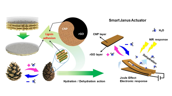 具有环境刺激响应性的柔性智能驱动器在机械、生物医药、传感器、人工肌肉和机器人等领域具有巨大的应用潜力。青岛能源所代谢物组学研究组的研究人员,受松果球鳞片湿度响应性形变现象的启发,利用木质素粘合策略构建了一种新型的纳米纤维素基柔性智能驱动器。