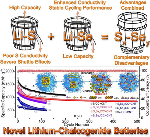 青岛能源所先进储能材料与技术研究组武建飞研究员多年来深耕锂硫电池领域,针对锂硫电池的本征缺陷提出了多种解决思路,并且取得了一系列的创新性研究成果(Journal of Materials Chemistry A, 6 (2018), 23486-23494; Electrochimica Acta, 295 (2019), 684-692; ACS Applied Materials & Interfaces, 11 (2019), 15607-15615; Advanced Materials Interfaces, 2020, 2001698)。业界在前期的研究发现,与硫同族的硒元素具有和硫类似的转化反应机理,并且锂硒电池的“穿梭效应”可以明显得到抑制。但较为可惜的是,与锂硫电池相比,锂硒电池容量较低,无法满足高比能电池的要求。针对这一问题,该研究组博士生杨泽文巧妙利用硫和硒的协同作用,通过弥补各自体系的“木桶短板”,成功设计开发了一种具有双碳双活性物质的新型锂-硫(硒)电池体系。该体系以壳聚糖基衍生碳为基底,三维缠绕碳纳米管构成双碳的活性物质载体,这可以有效提高三维碳载体骨架的导电性和结构稳定性;另外,通过煅烧方式负载硫-硒复合物作为活性材料,最终获得具有高容量、高循环稳定性能的锂硫(硒)电池正极材料。研究结果表明,在0.5 C(1 C=1340 mA·g-1)电流密度下,电池经过500次循环后仍然保持833.2 mAh·g-1的高比容量。此外,该工作还利用简便有效的测试手段对此电池体系的充放电机理进行了探讨,得出了硫-硒复合物作为活性物质的反应机理为锂硫和锂硒电池基本反应步骤的组合。本工作为解决锂硫电池的本征缺陷问题提供了新的参考思路;同时,也为硫族元素在锂金属电池中的研究和应用奠定了基础。本工作的相关研究成果最近以“Novel Lithium-Chalcogenide Batteries Combining S, Se and C Characteristics Supported by Chitosan-Derived Carbon Intertwined with CNTs”为题发表在国际著名期刊Chemical Engineering Journal上(Chemical Engineering Journal, 2022, 427, 131790。IF=13.273)。(文/图 杨泽文 张源)