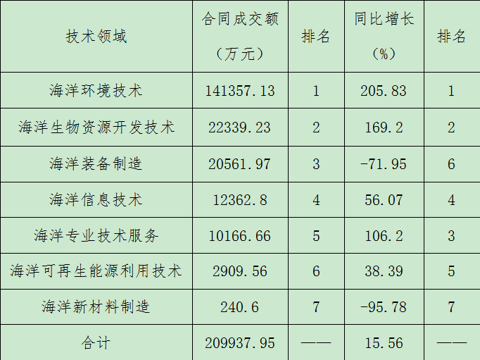 在海洋专业领域中,海洋环境技术成交额达141357.13万元,同比增长205.83 %,成交额居各领域首位;海洋生物资源开发技术成交额为22339.23万元,成交额居第二位,同比增长169.2%,增幅居第二位;海洋装备制造合同成交额20561.97万元,成交额居第三位;同比下降71.95%,增幅居第六位,海洋信息技术、海洋专业技术服务合同成交额分别为12362.8万元、10166.66万元,列第四、第五位。